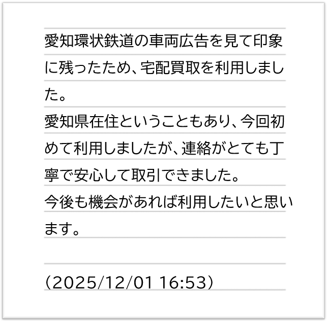 初めて利用しましたが、連絡がとても丁寧で安心して取引できました。/鉄道本舗 宅配買取 出張買取 口コミ 評判