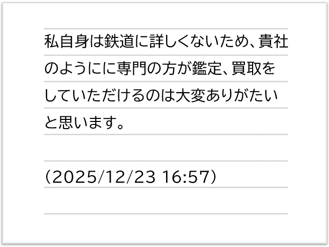 こんなに簡単に見積、買取を進めてくださって素晴らしいサービスだと思います。 /鉄道本舗 買取アンケート 口コミ 評判