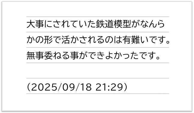 大事にされていた鉄道模型がなんらかの形で活かされるのは有難いです。無事委ねる事ができよかったです。