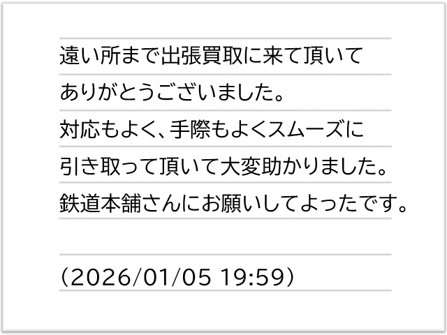 この度は鉄道本舗の出張買取サービスをご利用いただき、誠にありがとうございました。迅速かつ丁寧な対応にご満足いただけたとのお言葉を頂戴し、大変嬉しく存じます。今後も変わらぬ姿勢で、すべてのお客様に安心してお任せいただけるよう心がけてまいります。引き続き鉄道本舗をご愛顧のほど、何卒よろしくお願いいたします。
