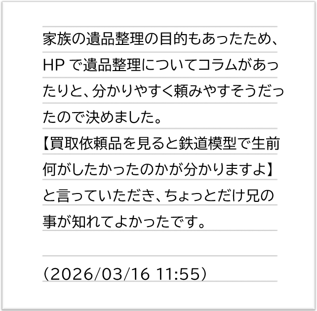 買い取って頂けて、本当に感謝してます。/鉄道本舗 宅配買取 出張買取 口コミ 評判