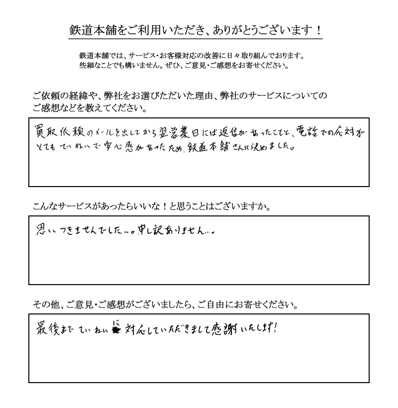 最後までていねいに対応していただきまして感謝いたします!/鉄道本舗 出張買取 宅配買取 口コミ 評判