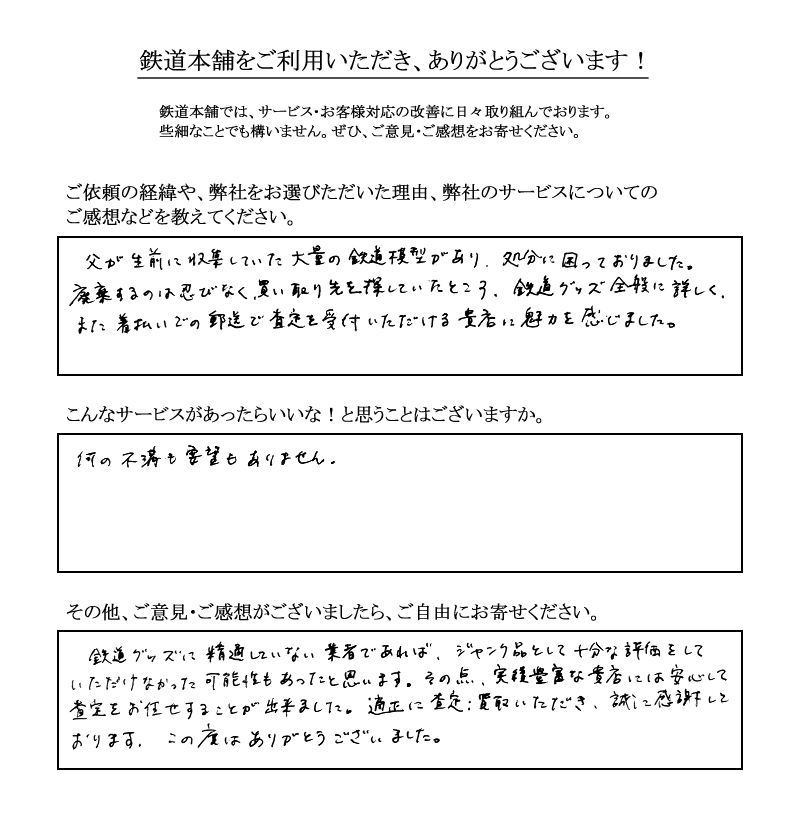 父が生前に収集していた大量の鉄道模型があり、処分に困っておりました。廃棄するのは忍びなく、買い取り先を探していたところ、鉄道グッズ全般に詳しく、また着払いでの郵送で査定を受付いただける貴店に魅力を感じました。