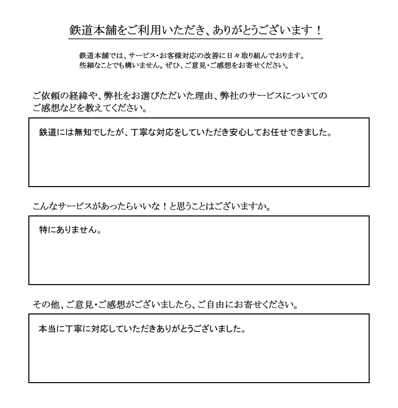 丁寧な対応をしていただき安心してお任せできました。/鉄道本舗 出張買取 宅配買取 口コミ 評判