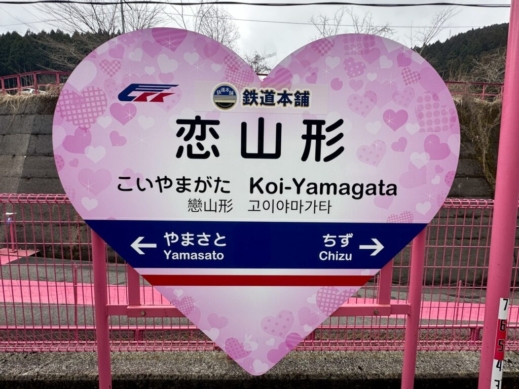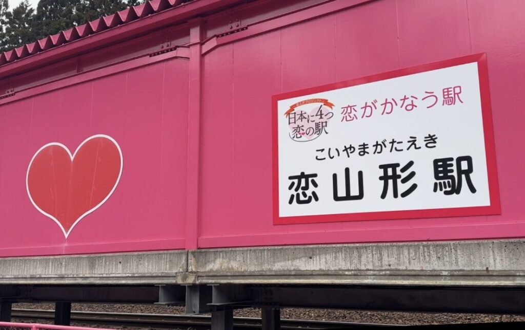 鳥取県にある「恋山形駅」は、駅舎全体がピンク色で彩られ、ハートのモニュメントや装飾が施された“恋がかなう駅”として親しまれています。
